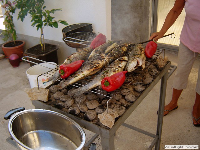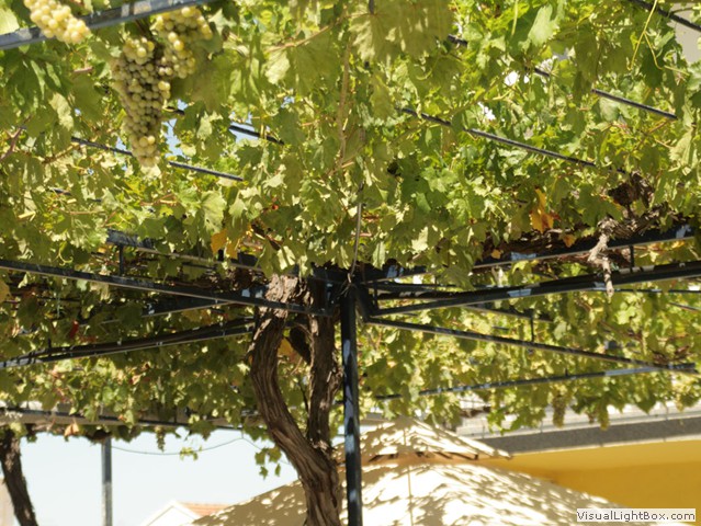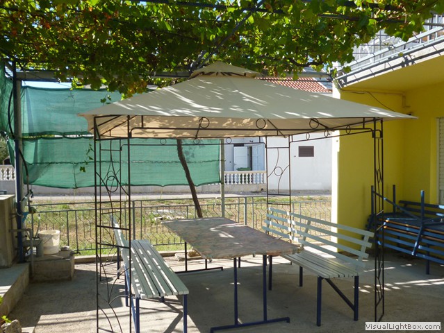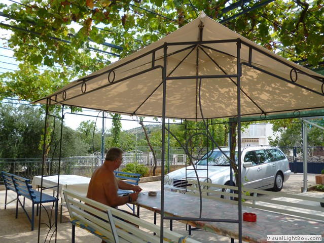 Weinrankenüberdachte Sitzgelegenheiten und ein großer Grill sorgen für zünftige Feste oder aber auch für einfach gemütliches Chillen.